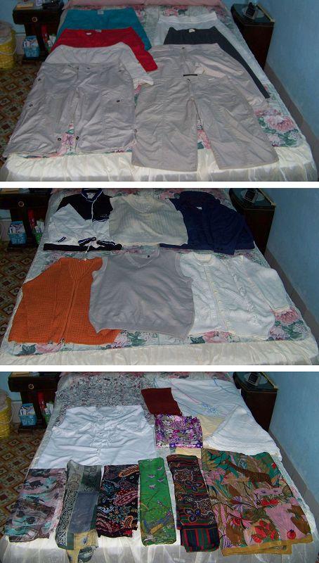 Se vende ropa nueva y de uso, en buen estado. Todas las piezas son de Europa, tallas M y L: 13 blusas, 4 de ellas blancas muy finas, 3 pullovers de mujer, 1 saya larga, 1 guayabera de hombre bordada, 7 camisas, 2 chalecos de hombre, 2 abrigos de mujer, 2 abrigos de hombre, 5 pantalones de mujer, 4 bermudas de mujer, 3 shortpants, 3 manteles circulares, 2 tapetes finos, 4 pañuelos de cuello o de cabeza grandes, 1 corte de tela de seda floreada de más de 2 metros, 1 bufanda carmelita. Son 54 piezas en total. Se vende todo junto en 10000 cup con la maleta de la foto.