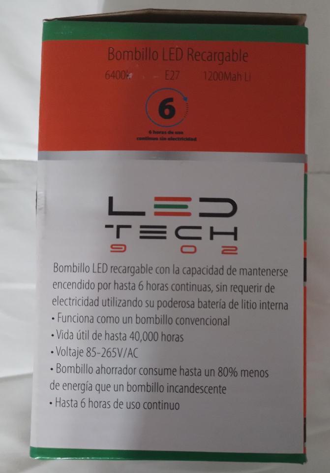 Bombillo LED recargable con la capacidad de mantenerse encendido por hasta 6 horas continuas, sin requerir de electricidad utilizando su poderosa batería de litio interna.